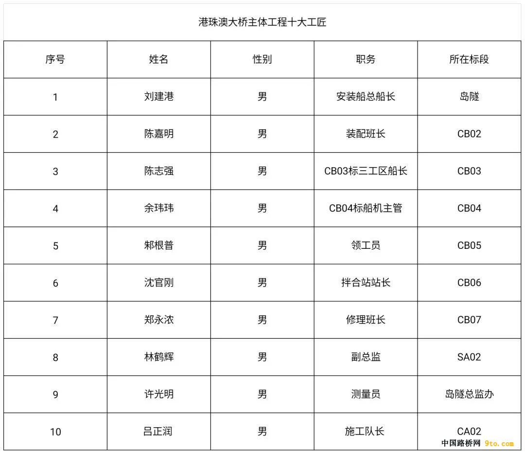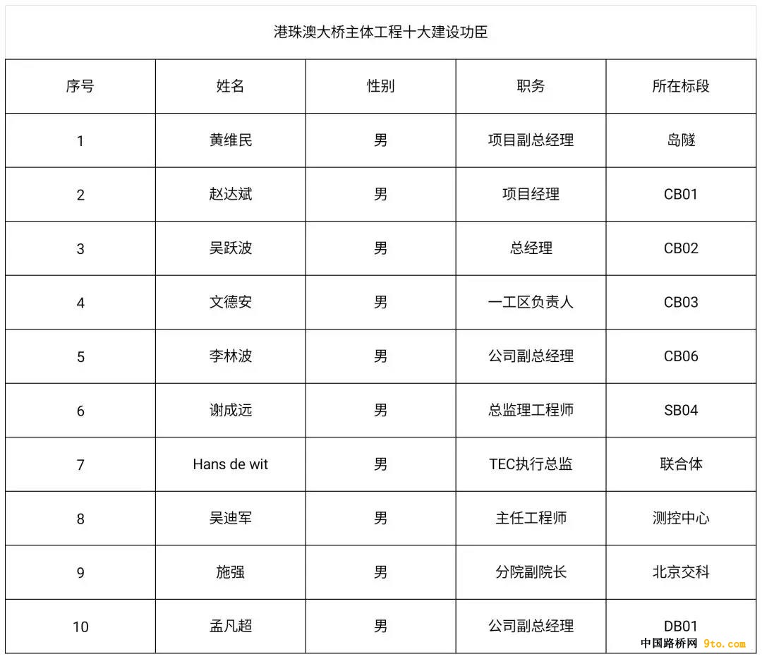 大会授予林鸣等10位同志“港珠澳大桥十大领军人物”称号,赵达斌等10位同志“港珠澳大桥十大建设功臣”称号,陈嘉明等10位同志“港珠澳大桥十大工匠”称号,梁德章等122位同志“港珠澳大桥建设标兵”称号。 (具体名单请查看下方)